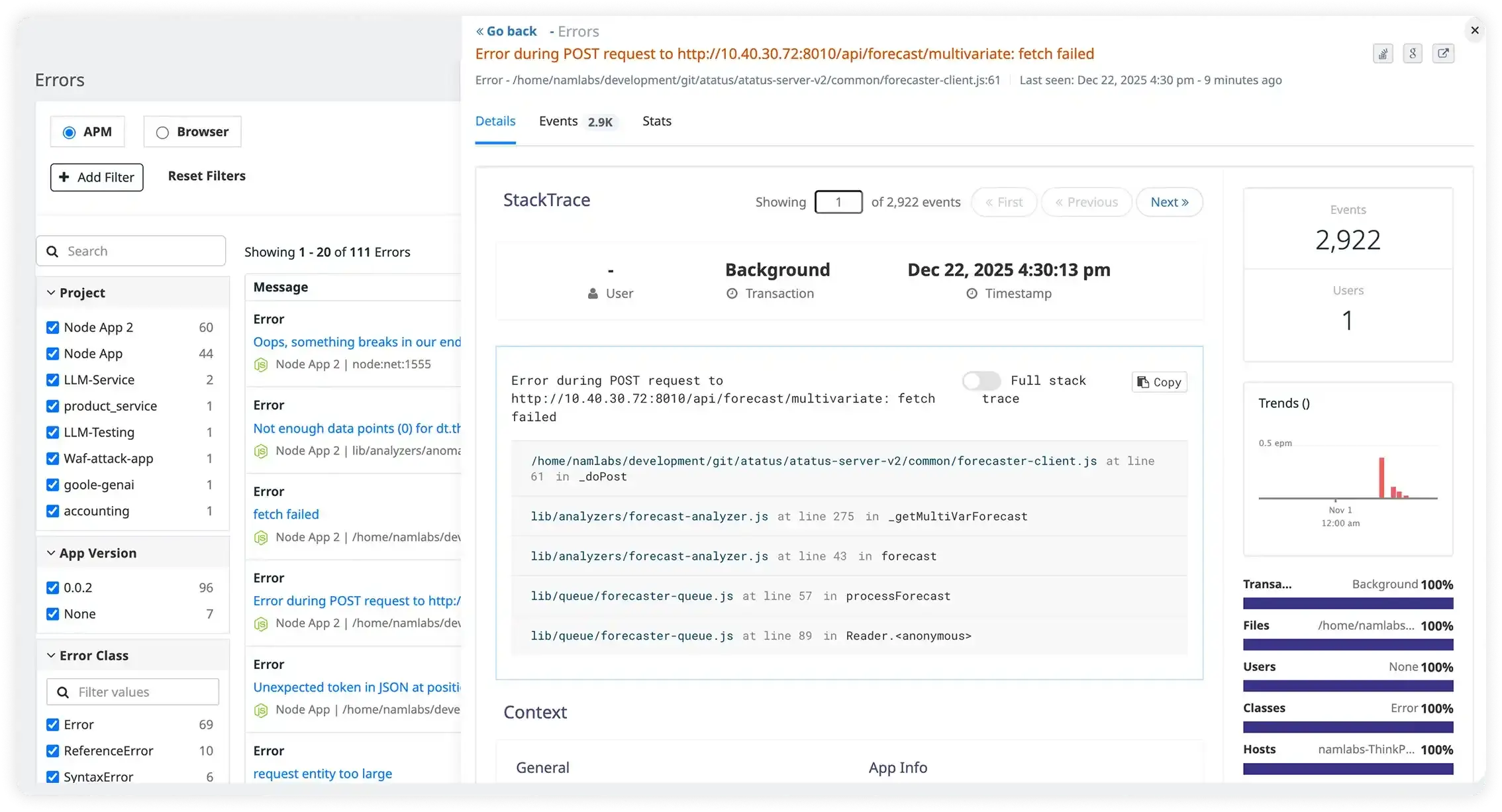 Access detailed stack traces, metadata, and environment info for each error, making it easier to diagnose root causes and fix issues quickly and accurately.