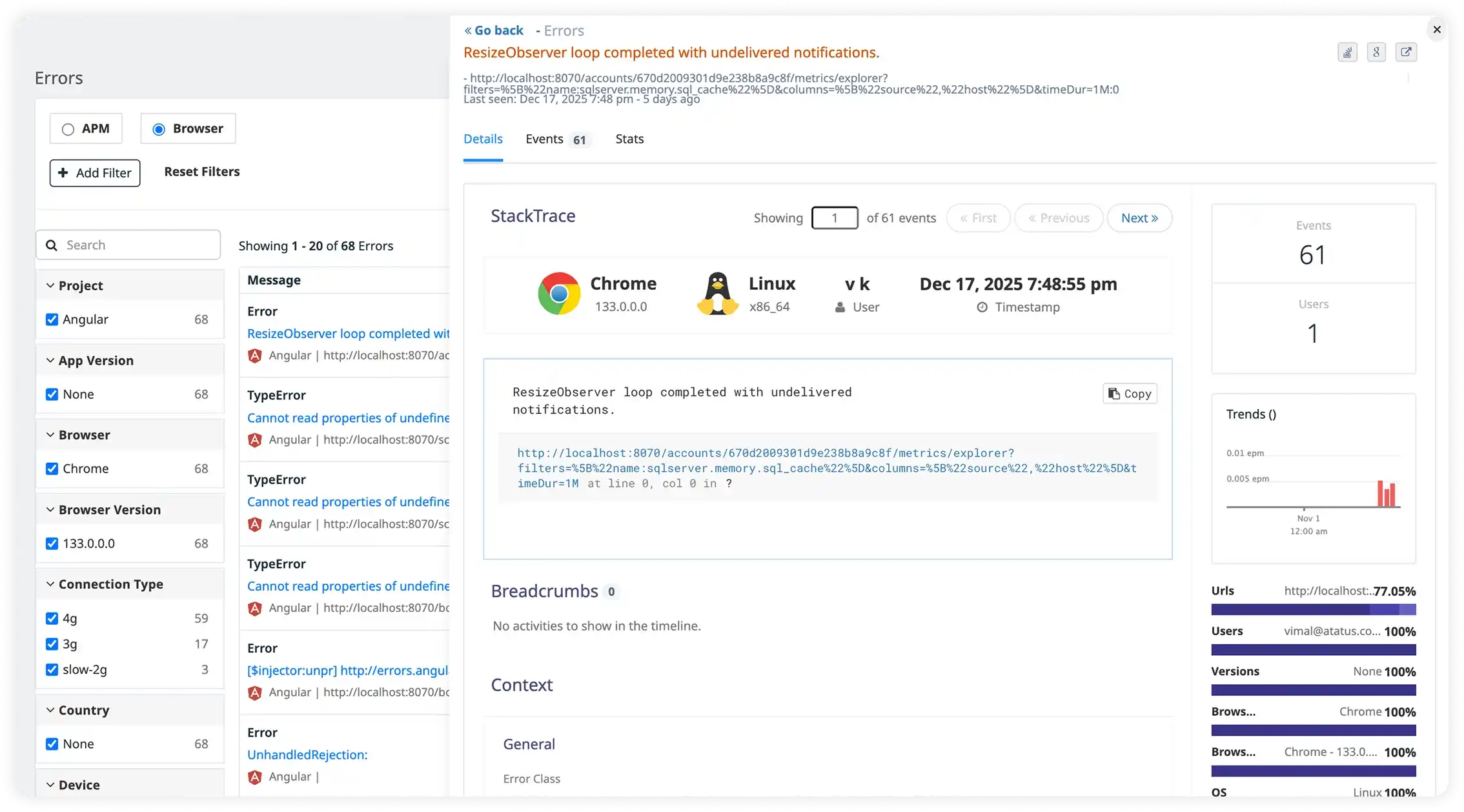 Get real-time error tracking, detailed stack traces, and instant root cause analysis with Atatus Crash Detection to minimize downtime and fix errors faster.