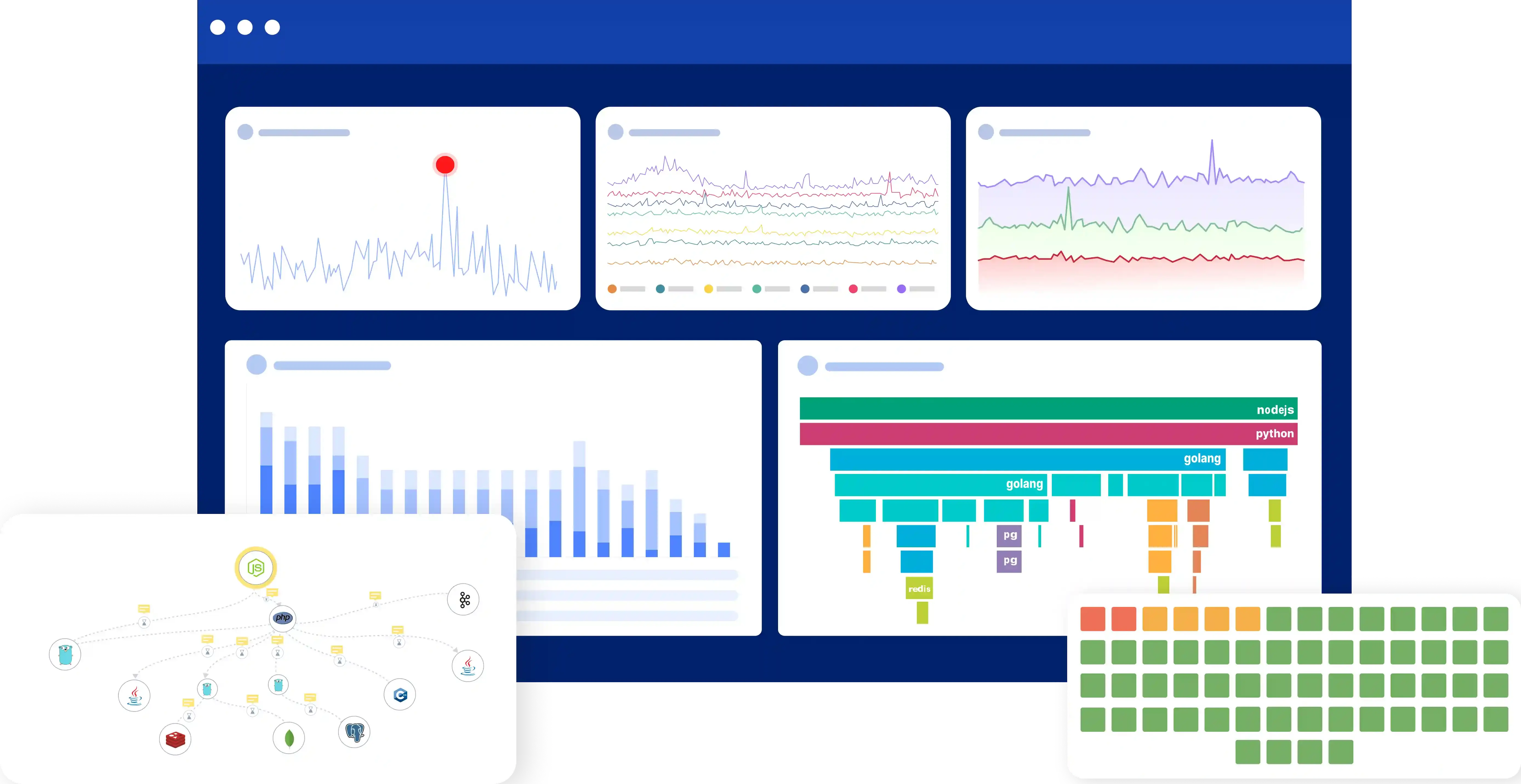 Single dashboard showing APM, infrastructure, logs, RUM, and synthetic monitoring. Correlate metrics across your entire stack without tool switching.
