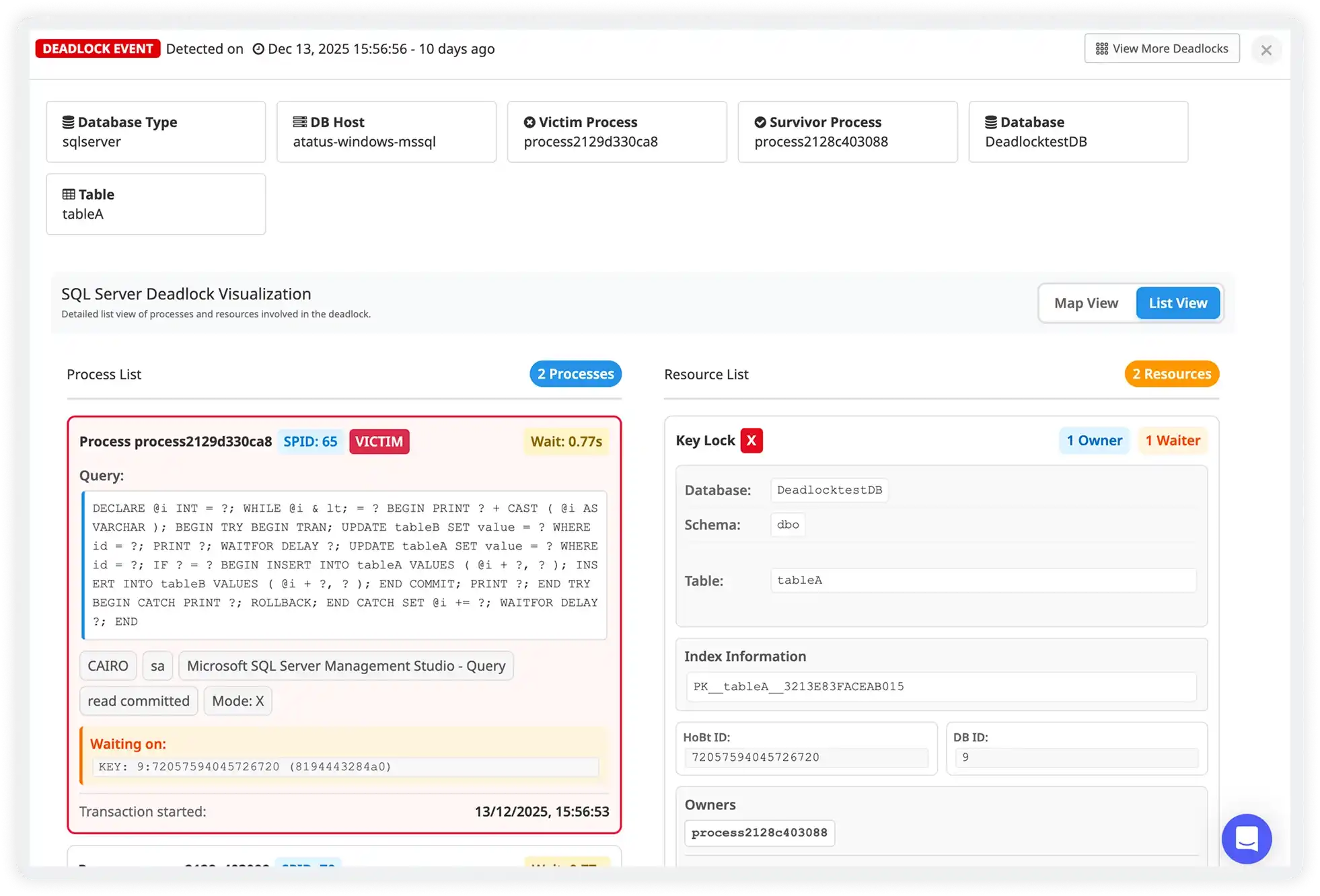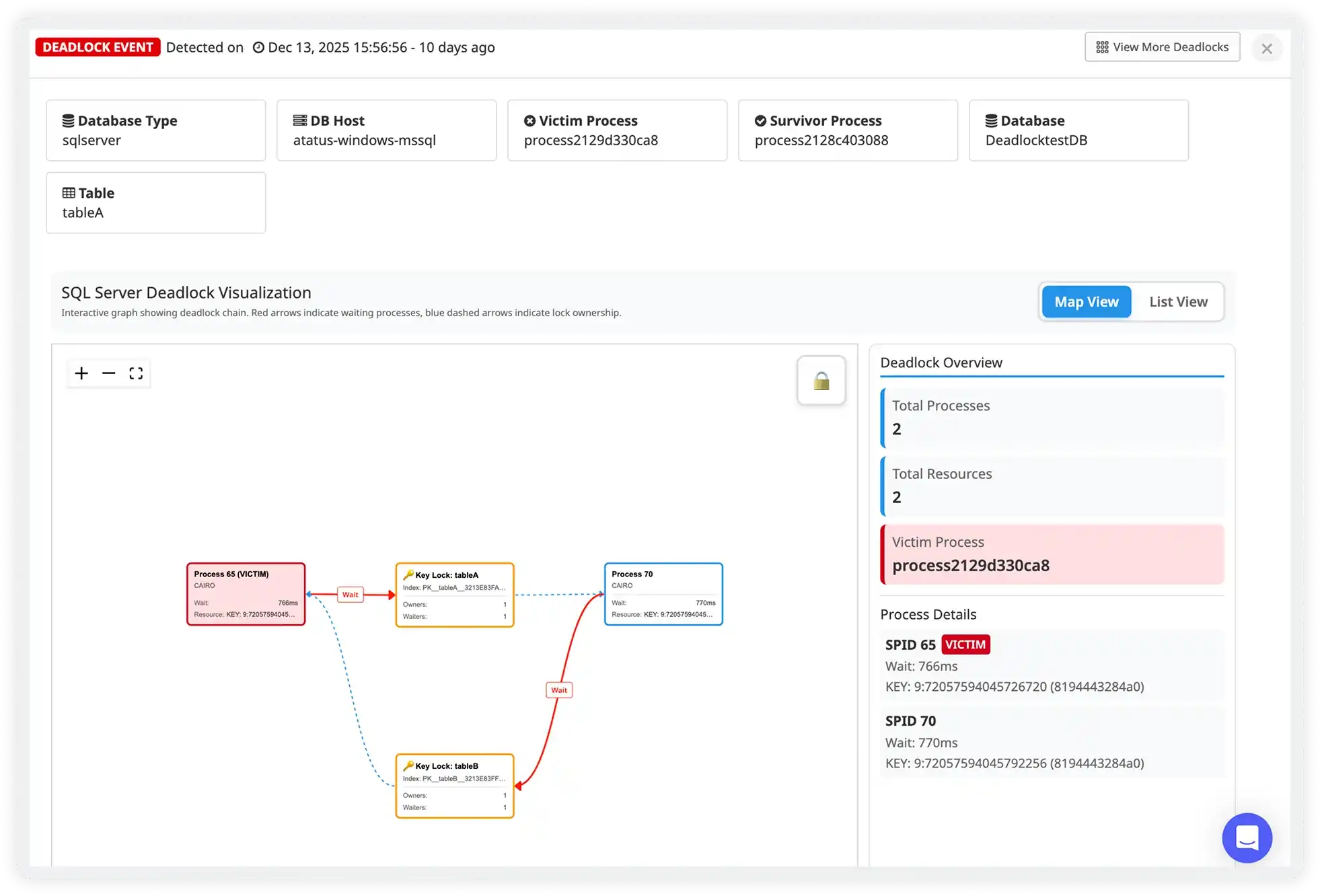 Interactive deadlock maps clearly show which processes are waiting, which locks are held, and how resources are contended. Quickly identify the victim path and dependency chain without reading raw logs.